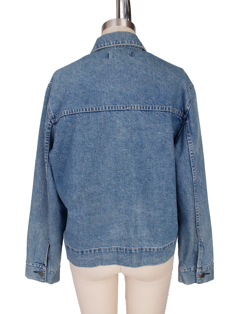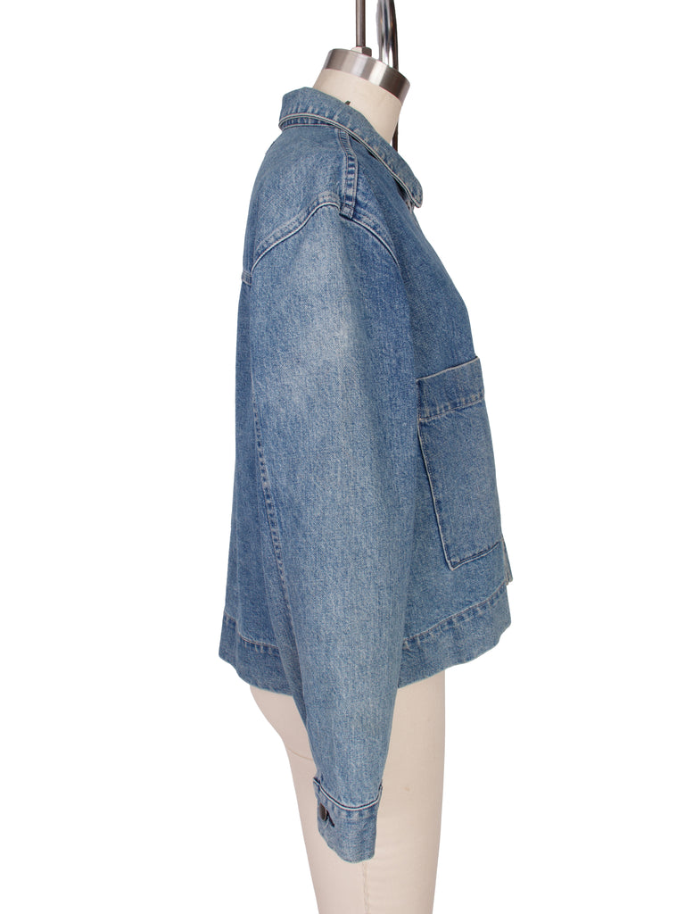 Micaela Greg denin boxy vut jacket in medium wash blue.