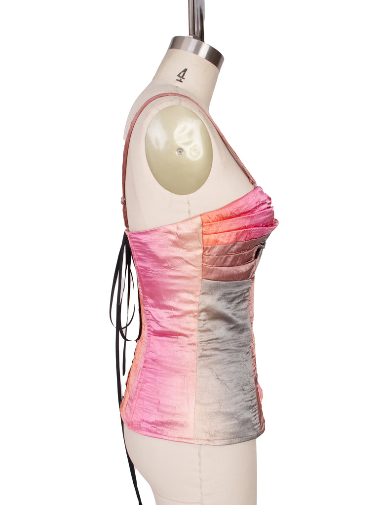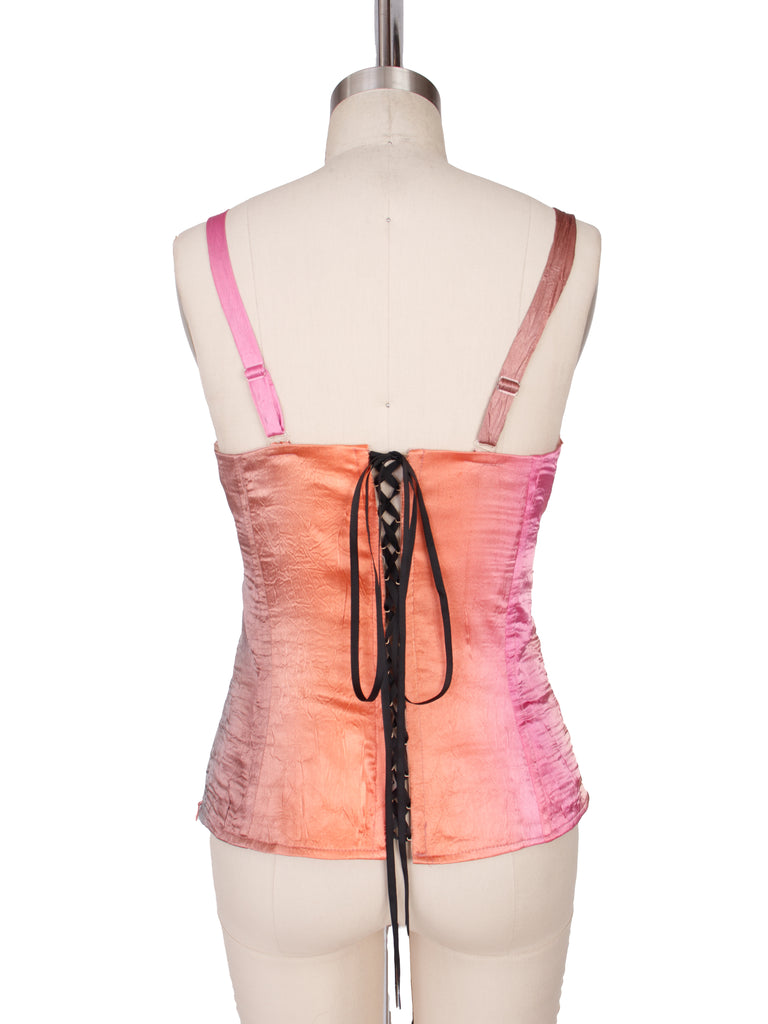 Lorrie Kabala crinkle satin ombré corset in pink, grey, orange and golden tan.