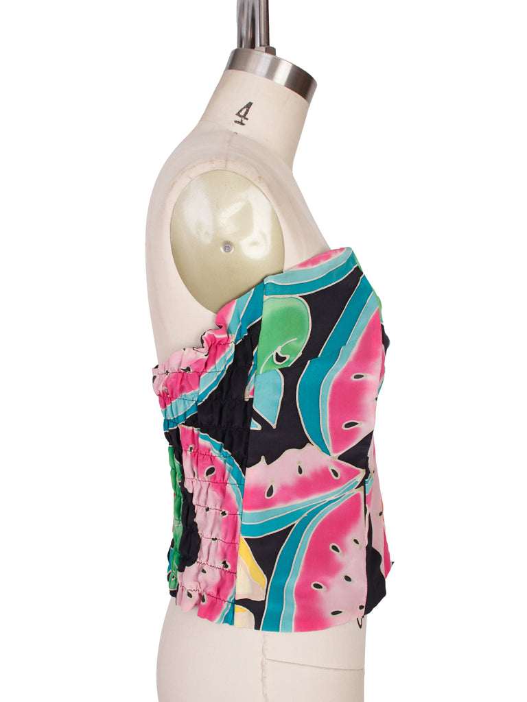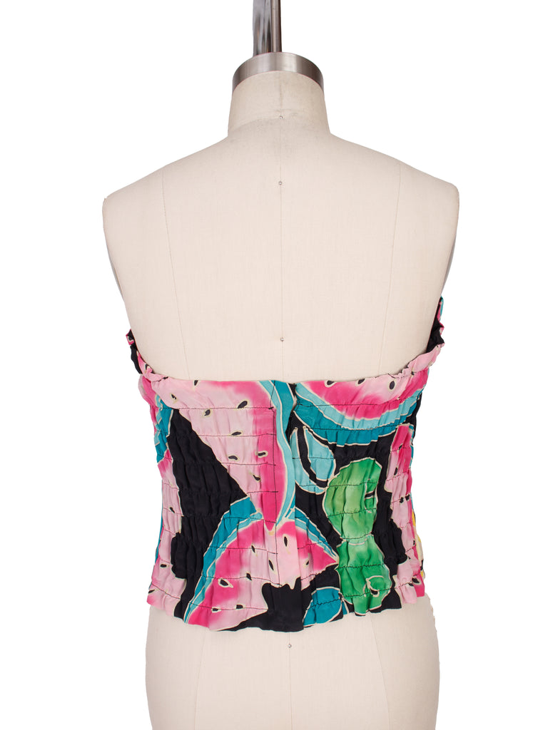 Silk Scapes hand painted silk watermelon fruits print corset in black and multicolor.