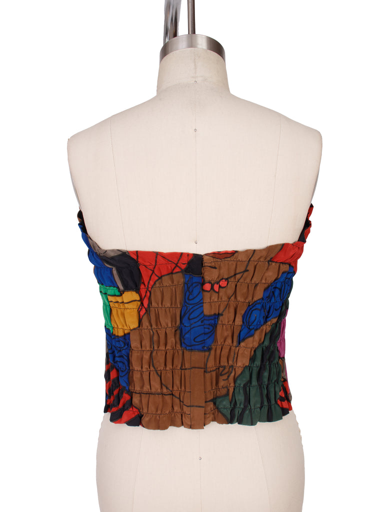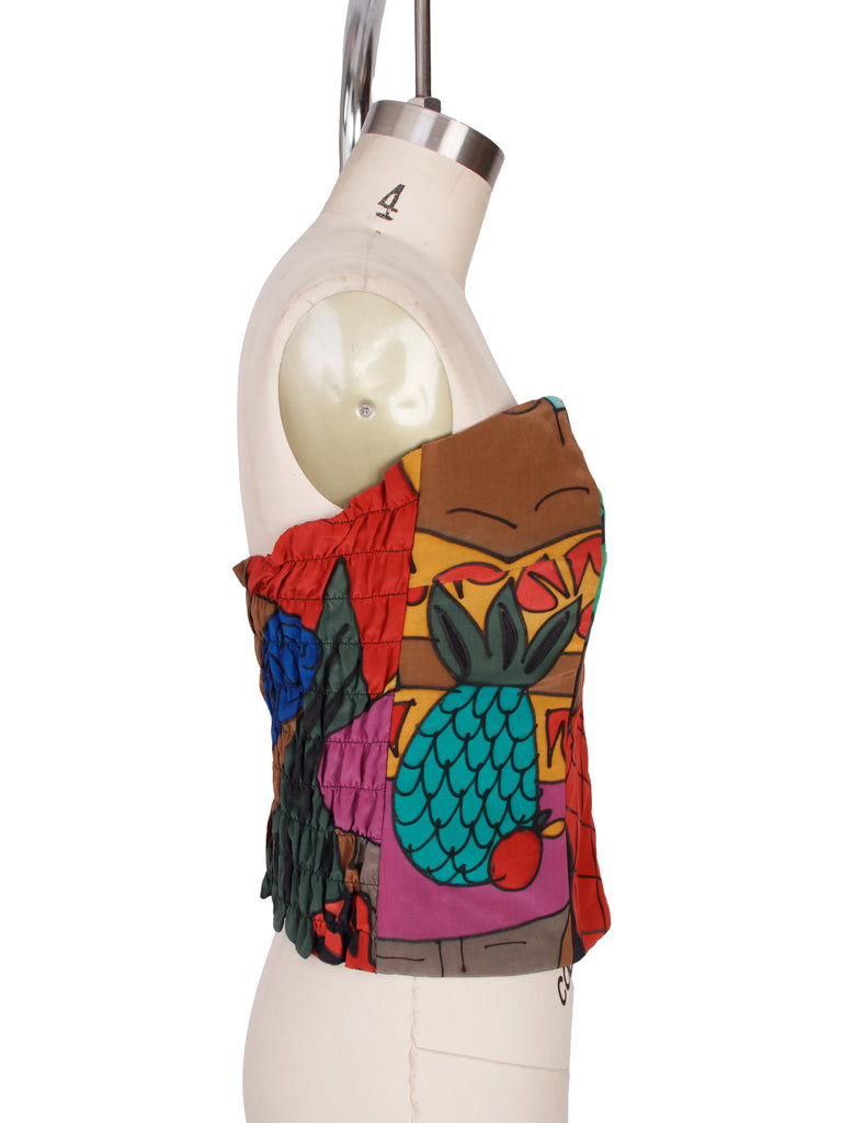 Silk Scapes hand painted silk fruits print corset in brown and multicolor.