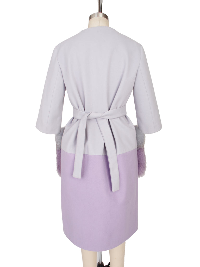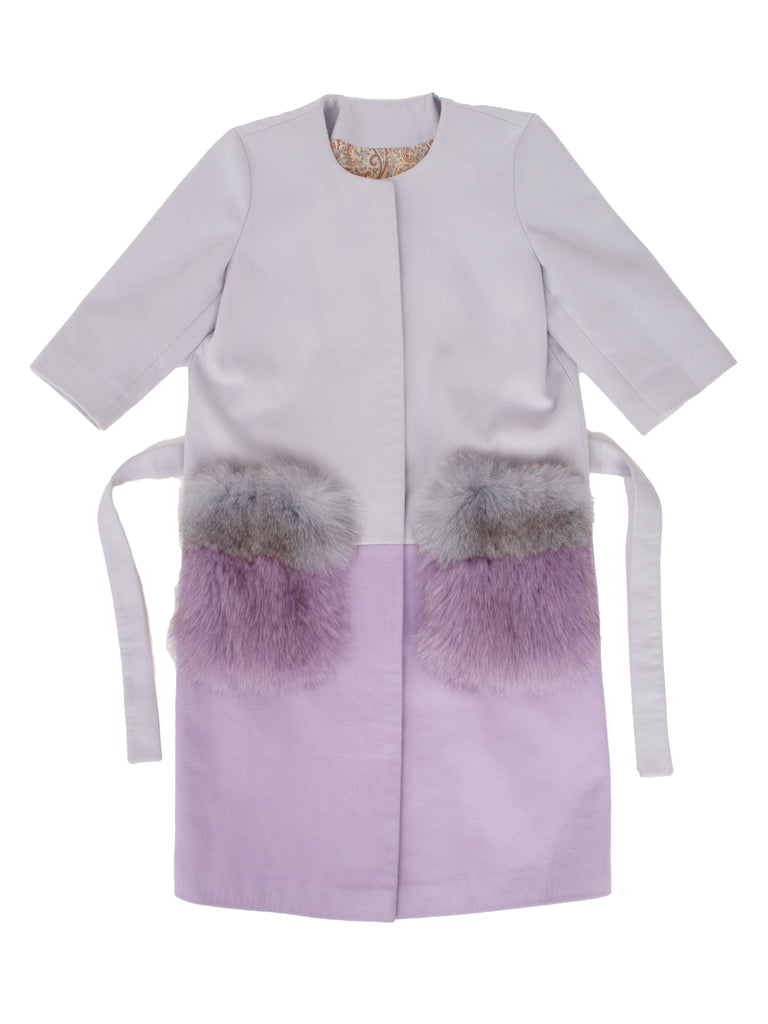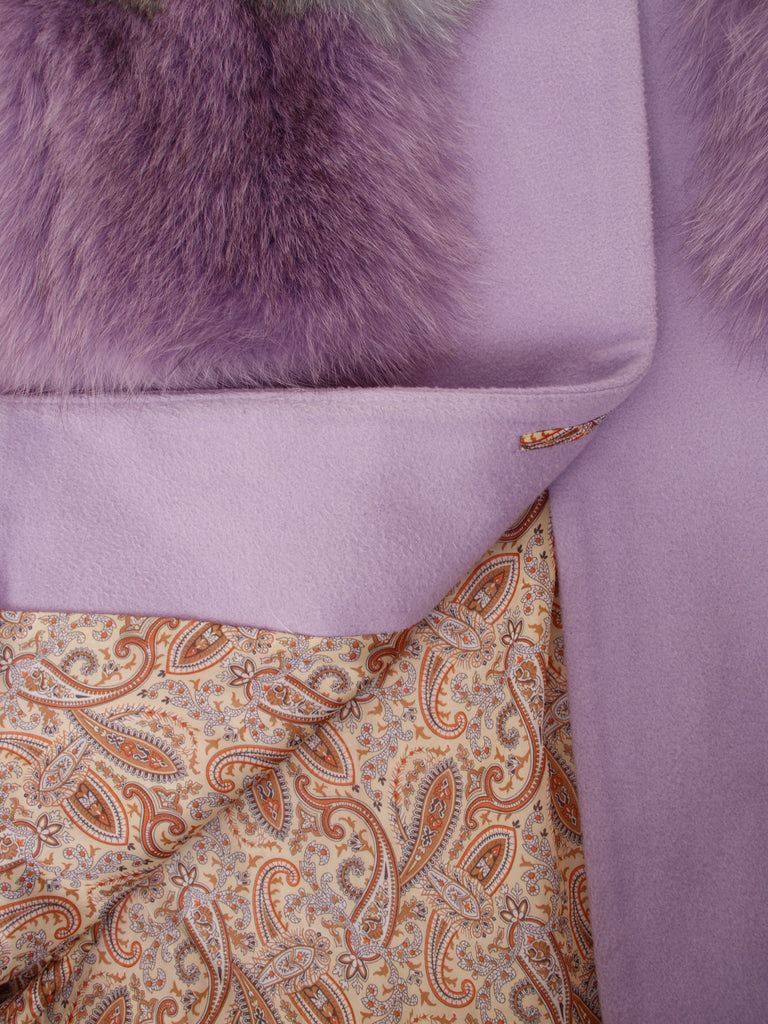 fabric not listed, feels like cashmere; trim feels like fox fur