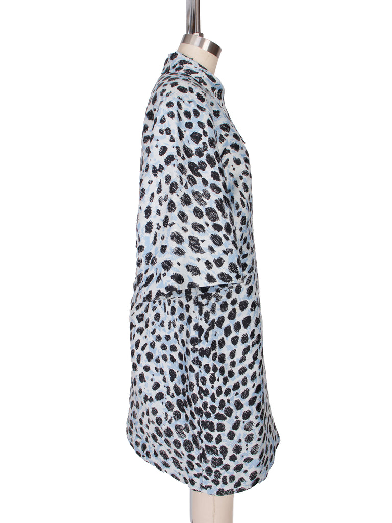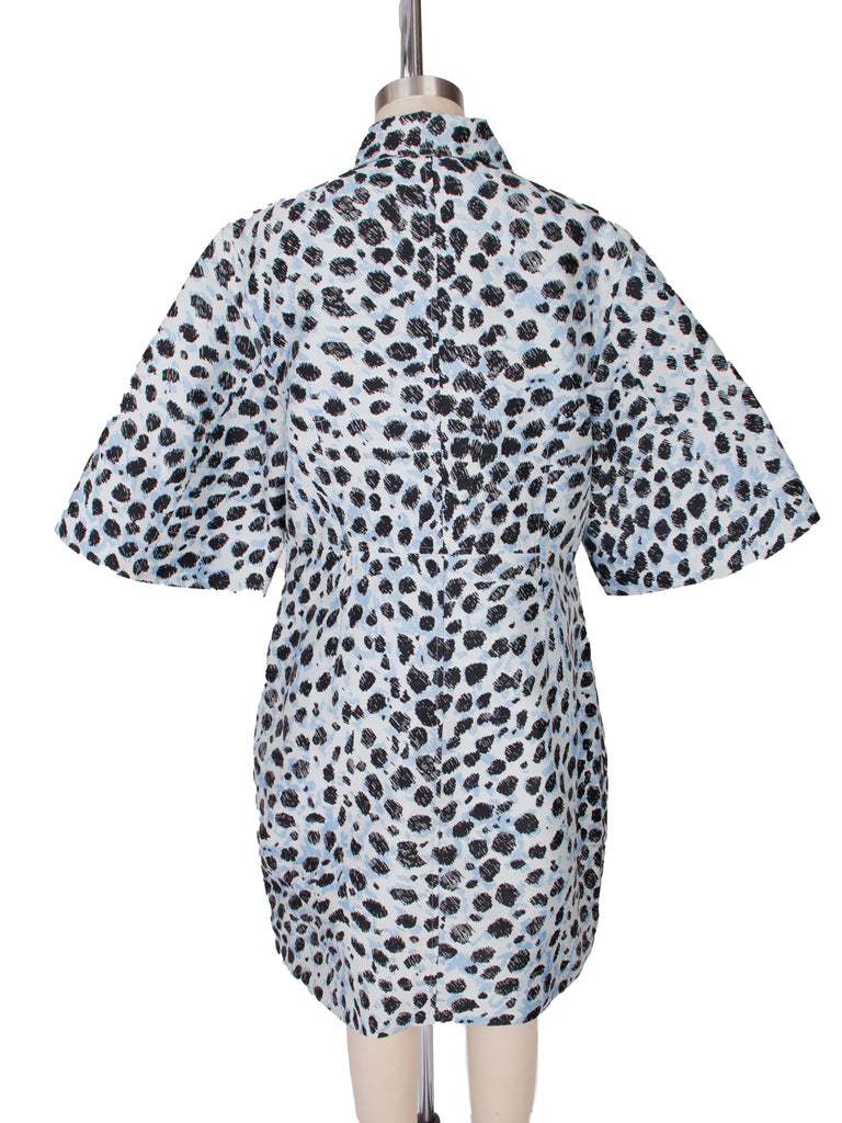 Ganni leopard jacquard pattern mini dress in blue, black and pale grey.