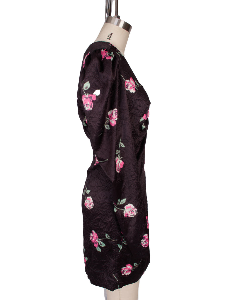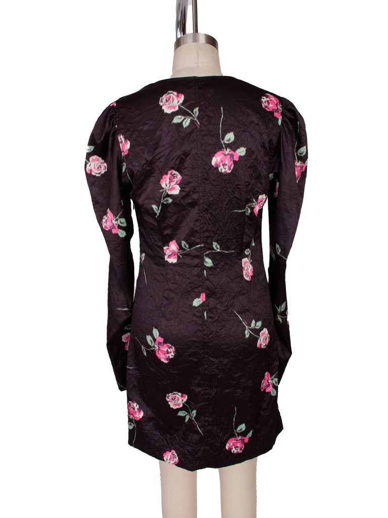 Ganni crinkled satin long sleeve mini dress in black and pink.