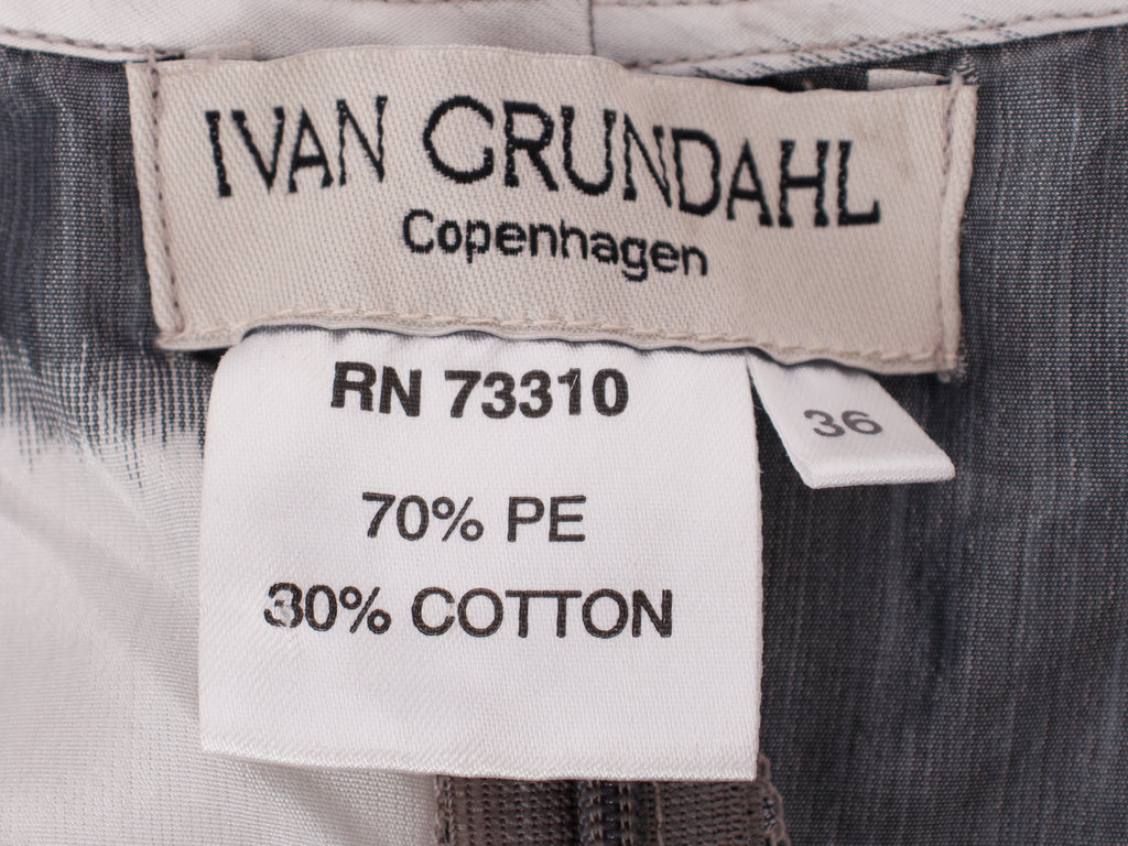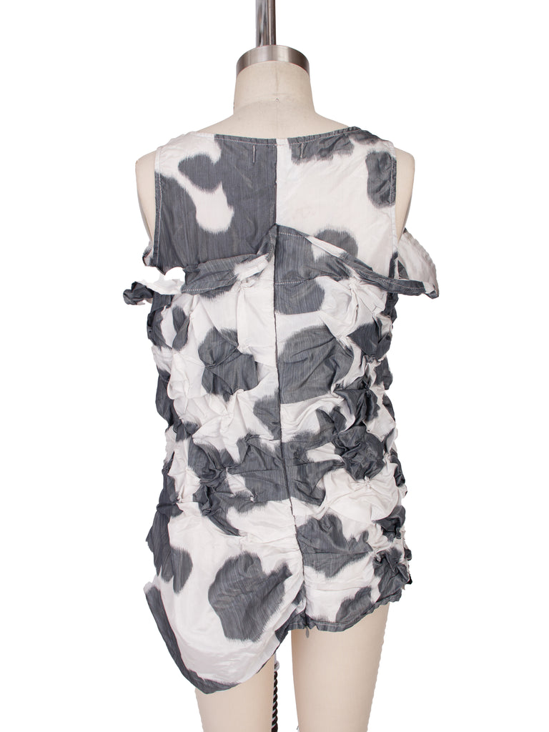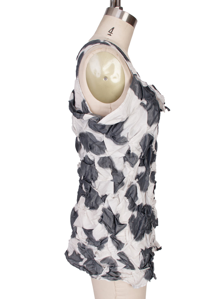 Ivan Grundahl abstract print pin-tucked sleeveless top in charcoal and white.