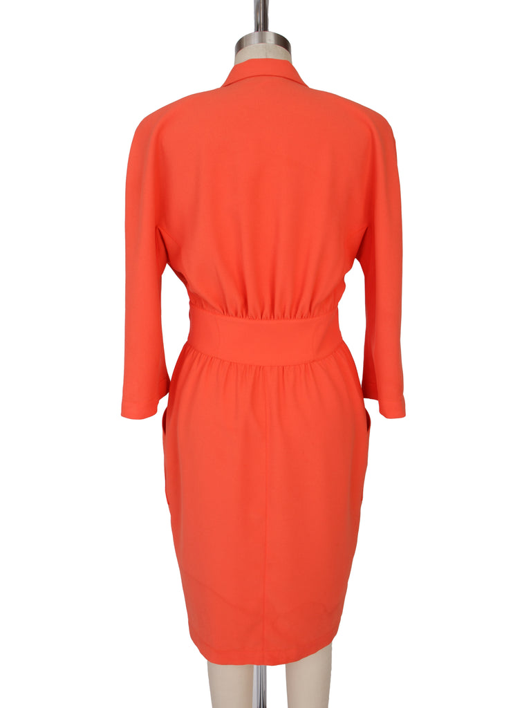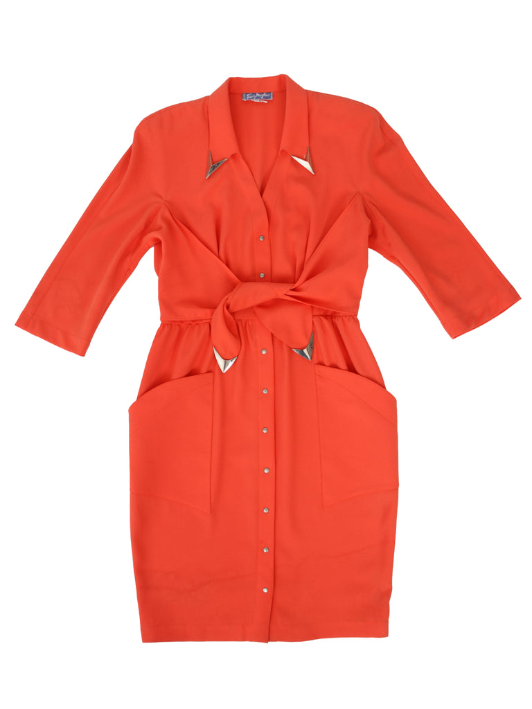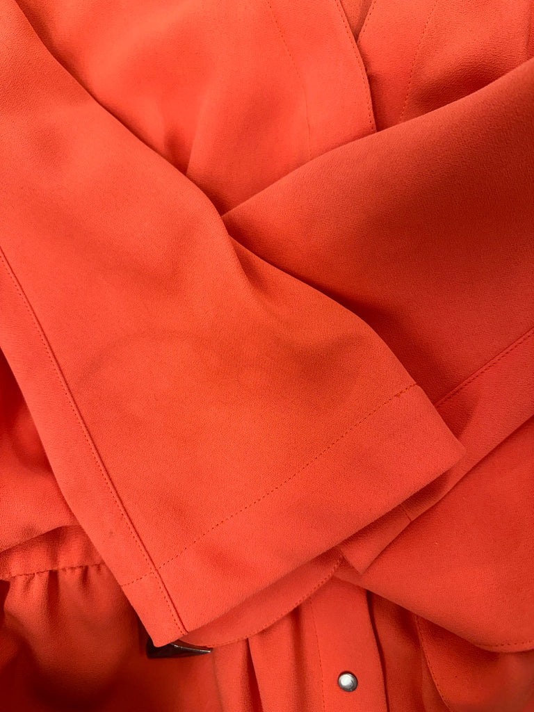 Discoloration at cuffs, hem and sides of waist tie; fabric tag missing; other signs of wear may be present.