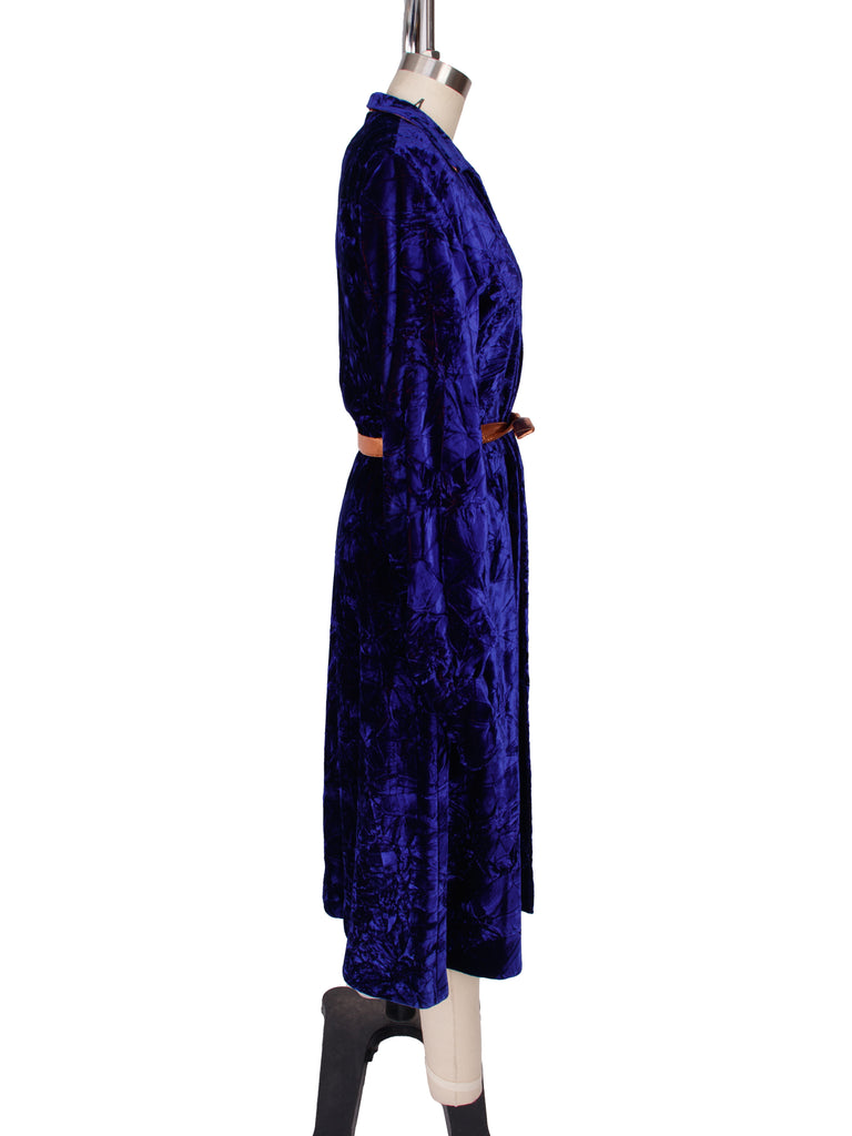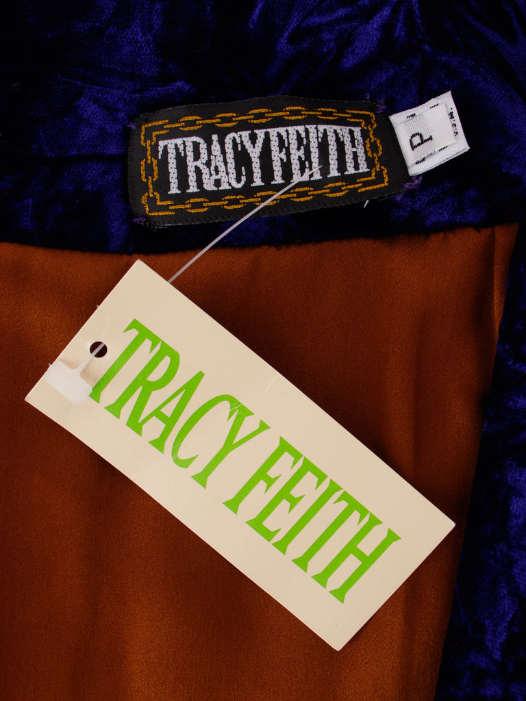 Tracy Feith silk crushed velvet coat in electric blue with a red shift.