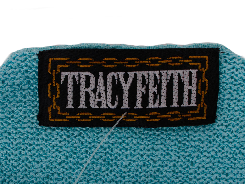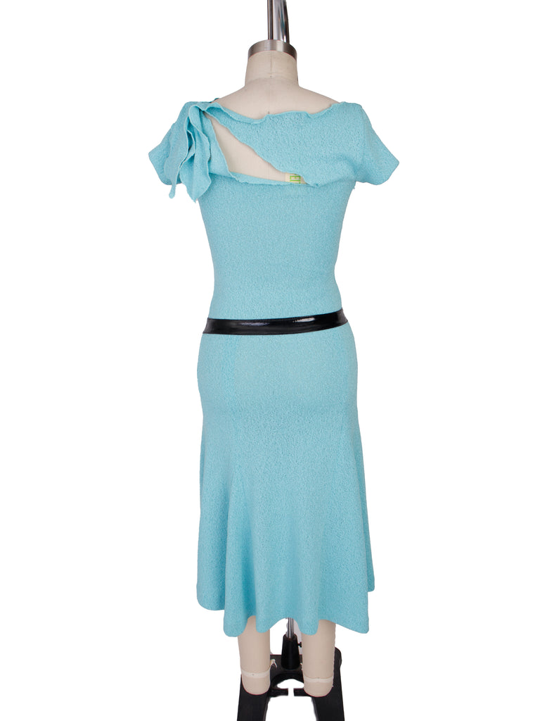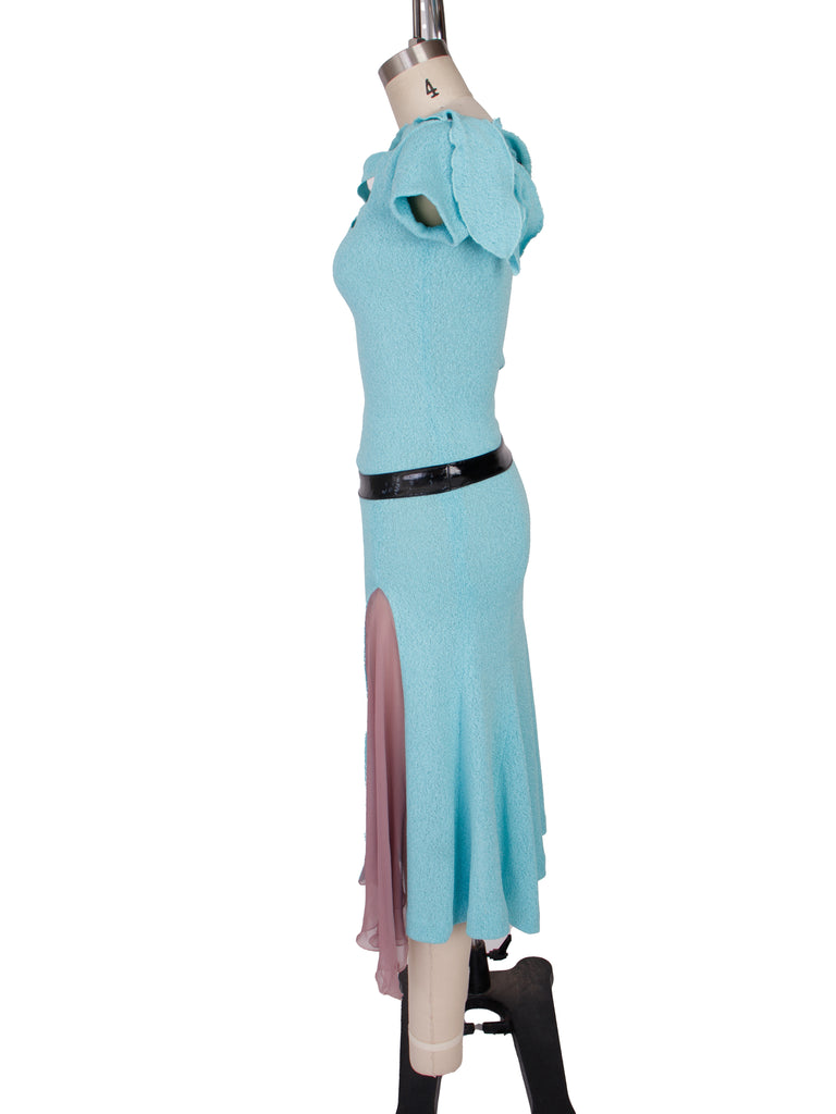 Tracy Feith knit midi dress in pastel turquoise blue and mauve.