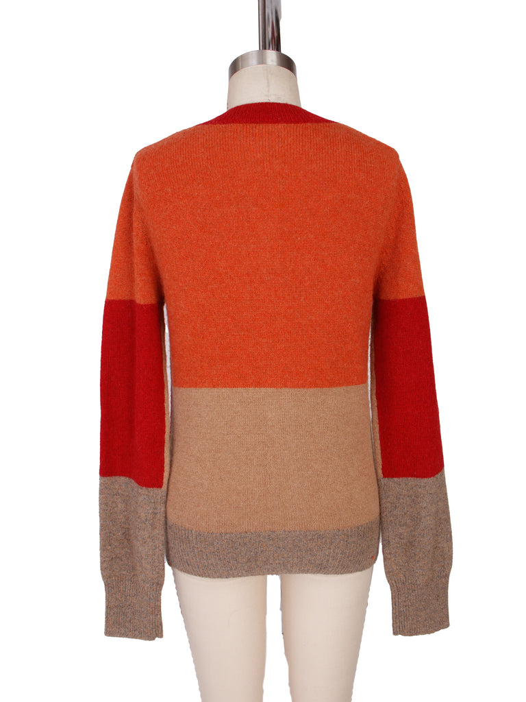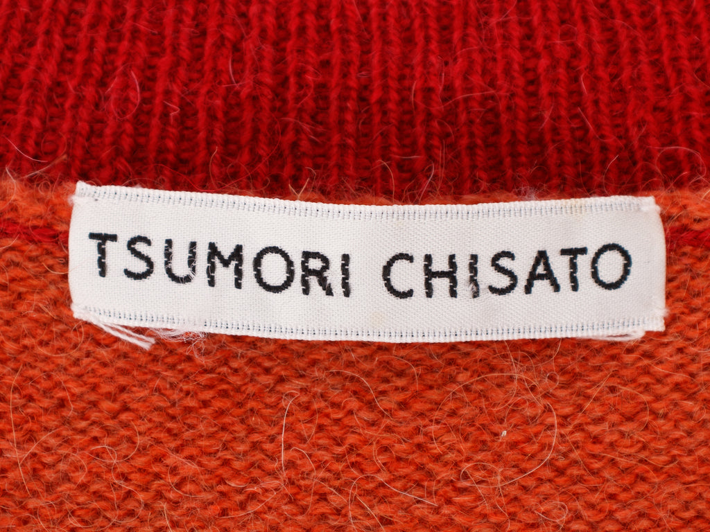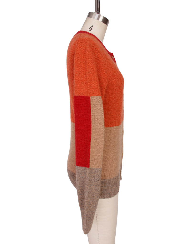 Tsumori Chisato camel lightweight knit color-block cardigan in orange and multicolor.
