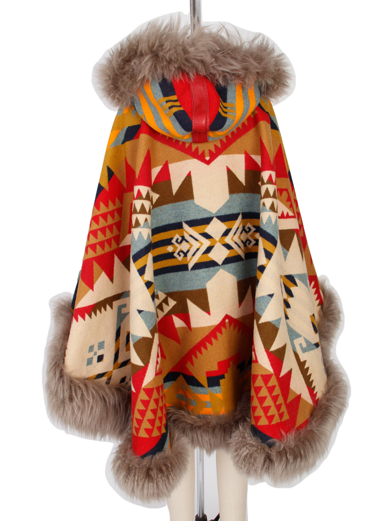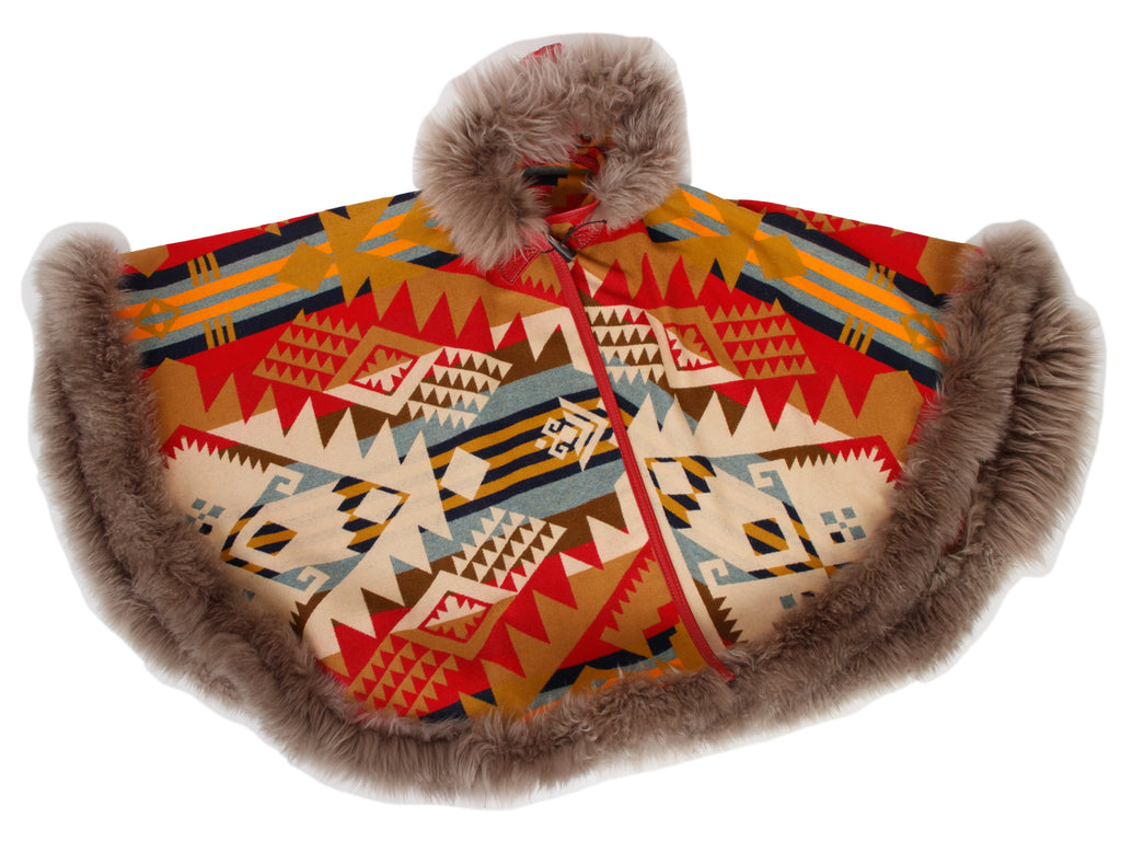 No fabric tags, main fabric feels like wool, first trim feels like shearling, second trim feels like leather.