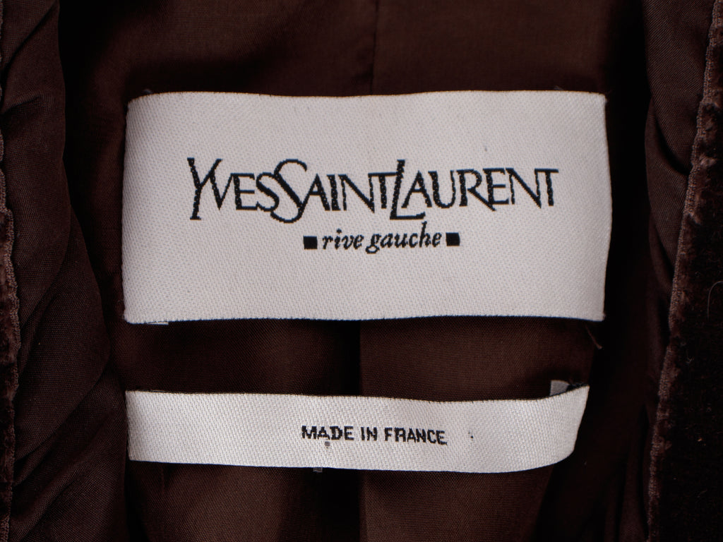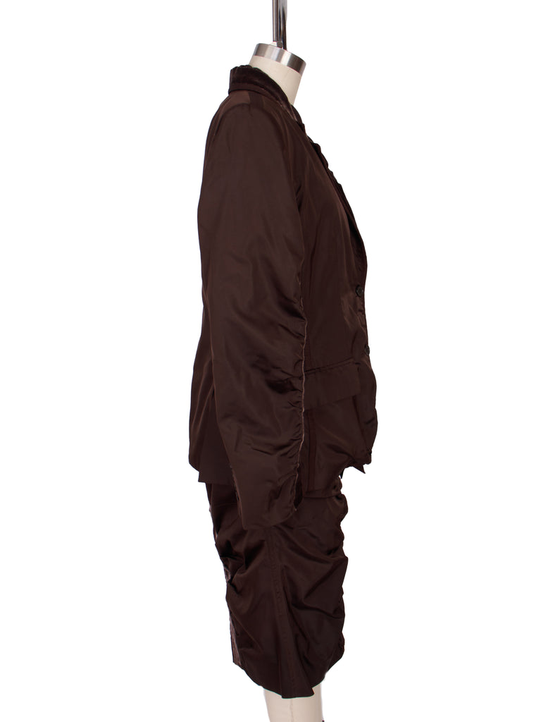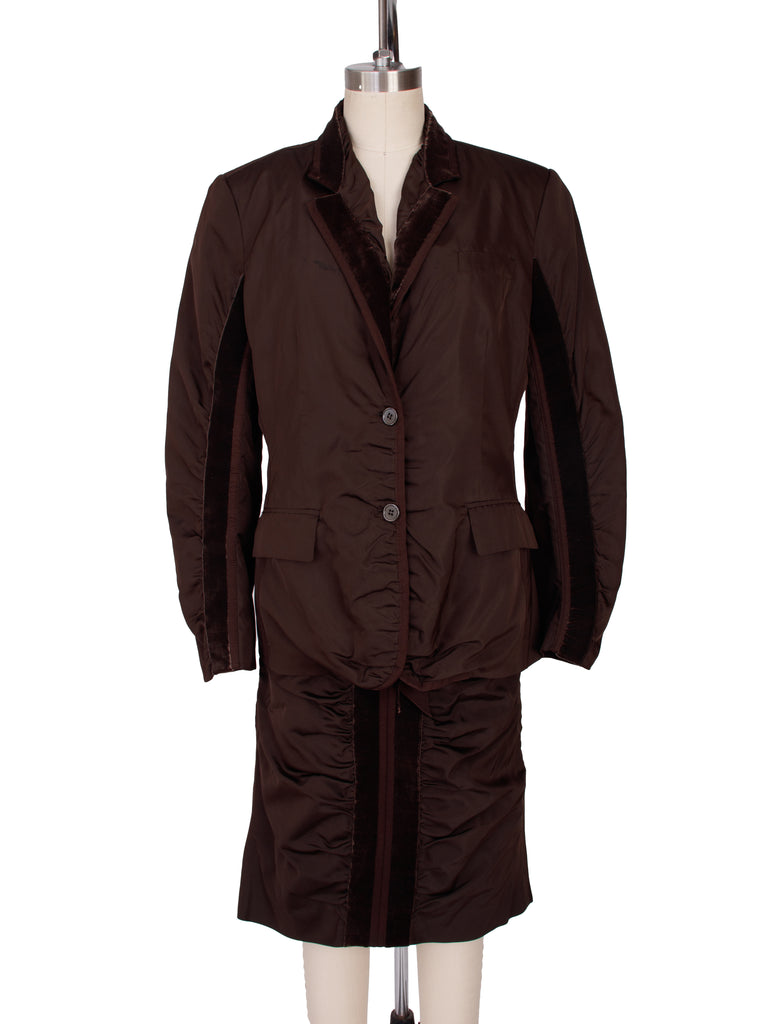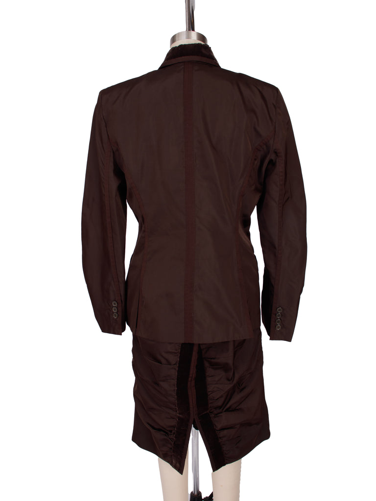 Yves Saint Laurent Rive Gauche silk taffeta blazer and skirt set in brown.